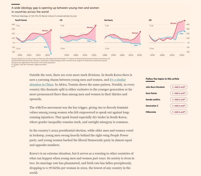 New polls indicate this trend is increasing internationally, while previous ones saw a drift to the right in young men while young women drifted to the left. This trend was most pronounced (from the countries polled) in South Korea (figure 1.), a country experiencing heightened capitalist exploitation with 18 hour work days, and undergoing a social reproduction crisis with the lowest birth rates in the world (now at 0.78).