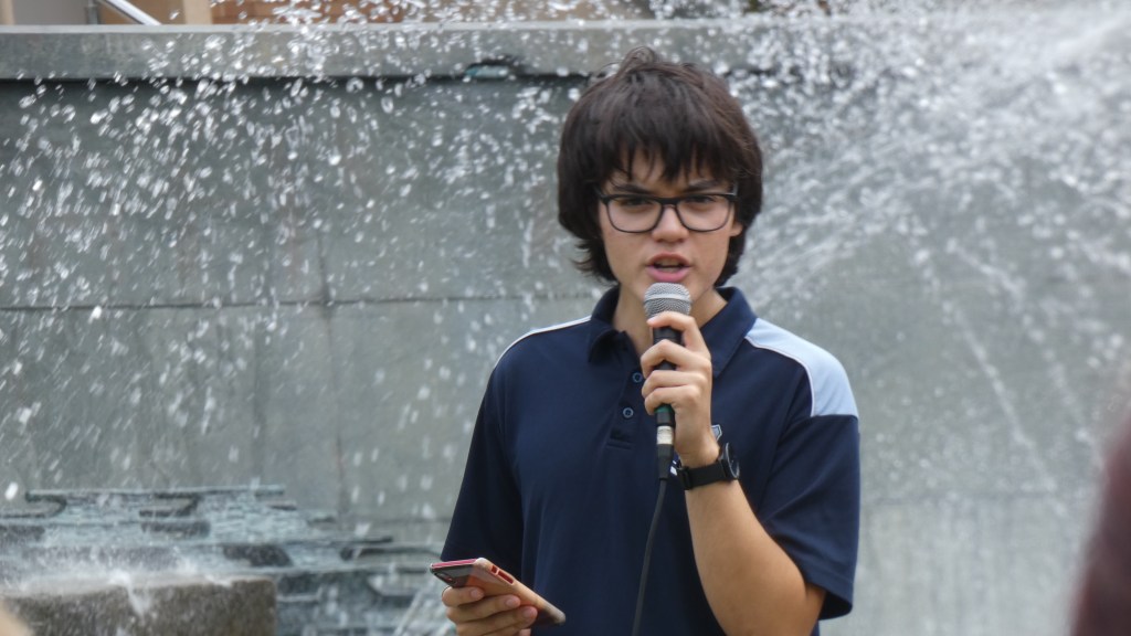 Student activist Fox addressed the crowd and introduced speakers. One speaker, Patrick, emphasised the role of the state in accelerating climate disaster. “The politicians have failed us. Our great, elected leaders will let the Earth burn for quick cash,” Patrick told the crowd, “They burn away our very future, and in a unique cruelty, teach us that it is happening but prevent us from stopping them.”