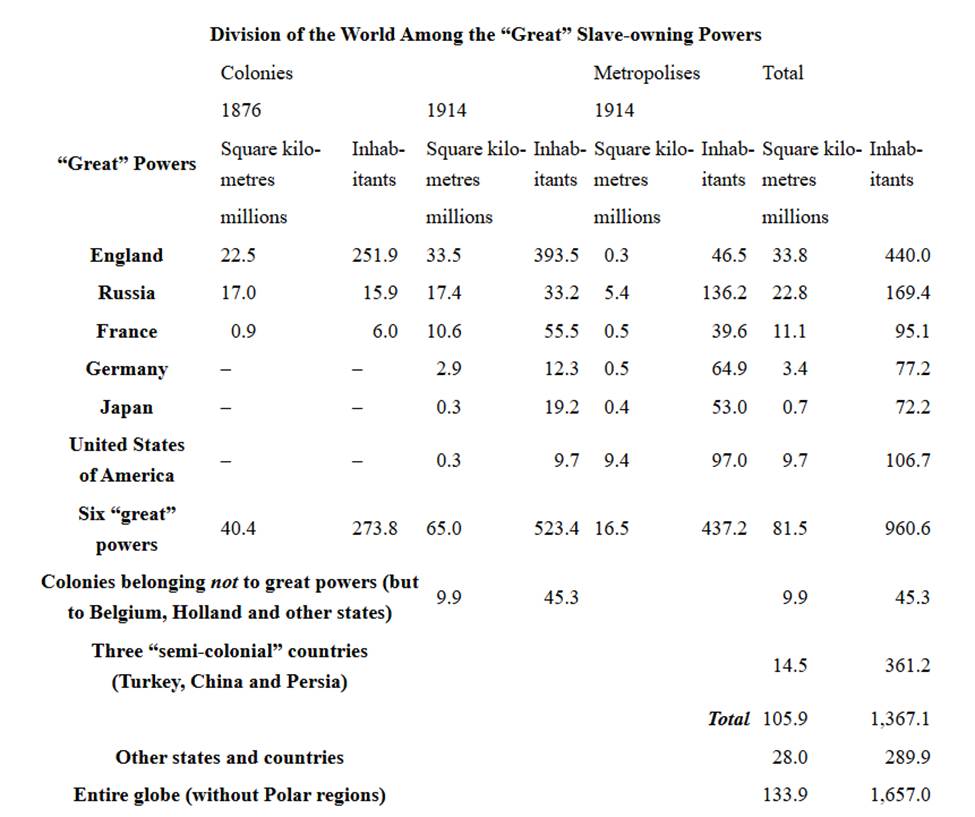 To explain the significance of imperialism, we will quote exact figures showing the division of the world among the so-called “great” (i.e., successful in great plunder) powers: