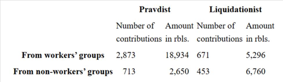 The open financial contributions of workers’ groups to the newspapers of the two parties, which was at that time a form of Social-Democratic membership dues adapted to Russian conditions (and the only one legally possible and freely verifiable by all), strikingly confirmed the proletarian source of the strength and influence of the Pravdists (Marxists) and the bourgeois-liberal source of that of the Liquidators (and their “O.C.”). Here are brief figures of these contributions, which are given in full in the book Marxism and Liquidationism4 and in an abbreviated form in the German Social-Democratic newspaper The Leipzig People’s Paper5 of July 21, 1914.